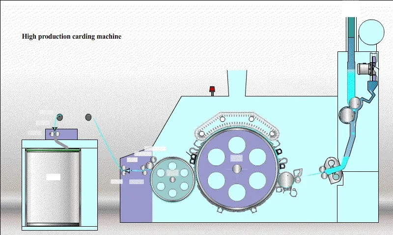 and remove neps, impurities and short fibers, then maker the crimp fibers into straight single fiber status, and concentrate the fibers into uniform sliver. The high speed coiler then will fill the can with the sliver to supply the after process. This carding machine unit is the ideal equipment to use in the blow room carding system.