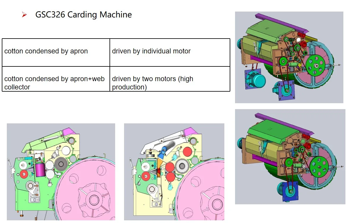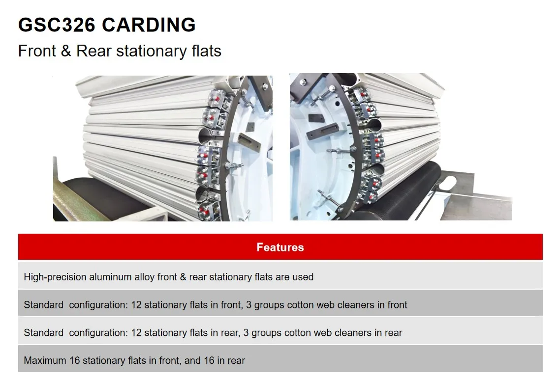 The machine unit is placed between blow room and draw frames and suitable for cotton fiber, cotton- type fiber, medium and long fiber. It will further open and card the loose cotton processed in the blow room line,